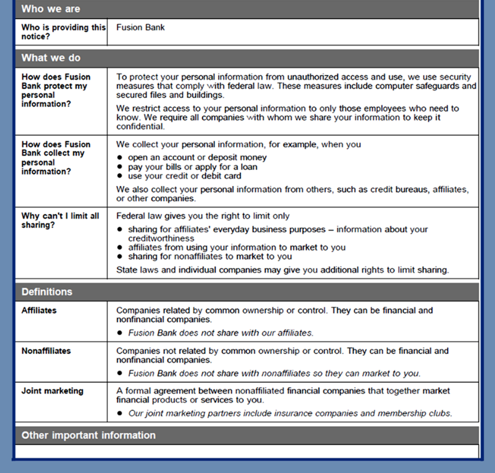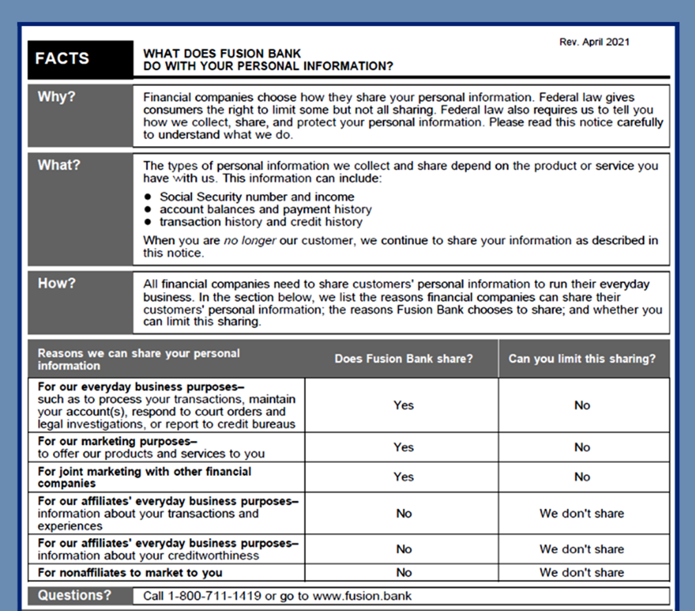 Trust is the cornerstone of the banking business. We welcome this opportunity to describe our privacy policies and the steps we take to protect your customer information. We want you to understand what information we collect, how we use it, and how we protect it. Fusion Bank values the trust you have given us. We intend to continue to earn your trust each day. We promise to protect your privacy and continue to keep your customer information secure.